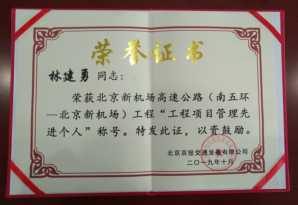 北京新机场高速公路(南五环-北京新机场)照明工程项目部林建勇经理在施工期间孜孜不倦,顽强拼搏,努力克服种种困难,带领兴南洋施工团队圆满完成了艰巨的建设任务,荣获“工程项目管理人先进个人”称号。