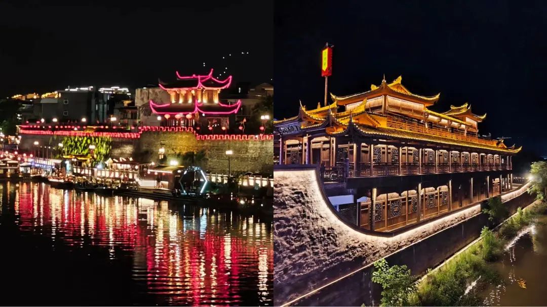 吃饱喝足大家走出门外就被长汀古城的夜景吸引住了目光。一了解才知道汀州古城始建于唐大历四年,历史十分悠久。大家纷纷结伴夜游古城,古城长汀一江两岸群灯璀璨、流光溢彩,大红灯笼高高挂,绚丽的夜景灯,把古城墙、城楼、汀江、古色古香街道勾勒得美轮美奂,甚是繁华。