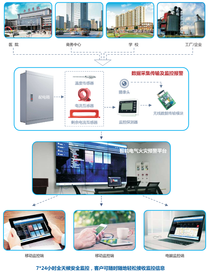 当电气设备中的电流、温度等参数发生异常或突变时,终端探测头(如剩余电流互感器、温度传感器等)利用电磁场感应原理、温度效应的变化对该信息进行采集…