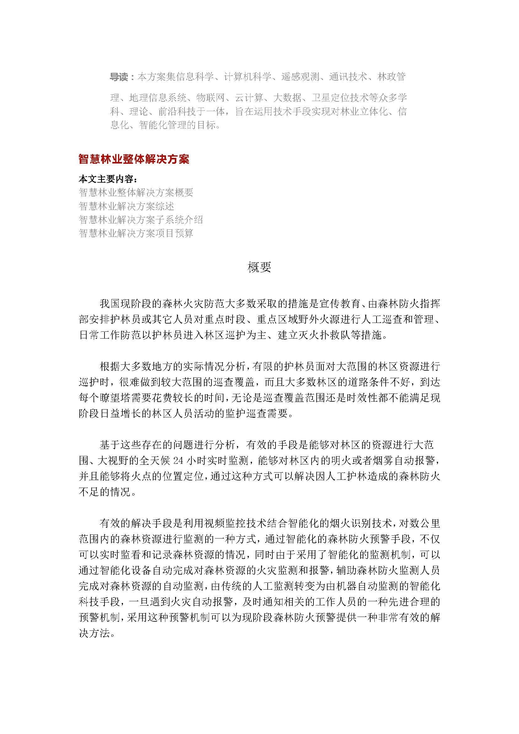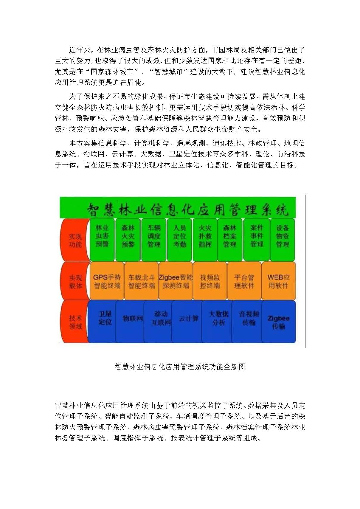 本方案集信息科学、计算机科学、遥感观测、通讯技术、林政管理、地理信息系统、物联网、云计算、大数据、卫星定位技术等众多学科、理论、前沿科技于一体,旨在运用技术手段实现对林业立体化、信息化、智能化管理的目标。