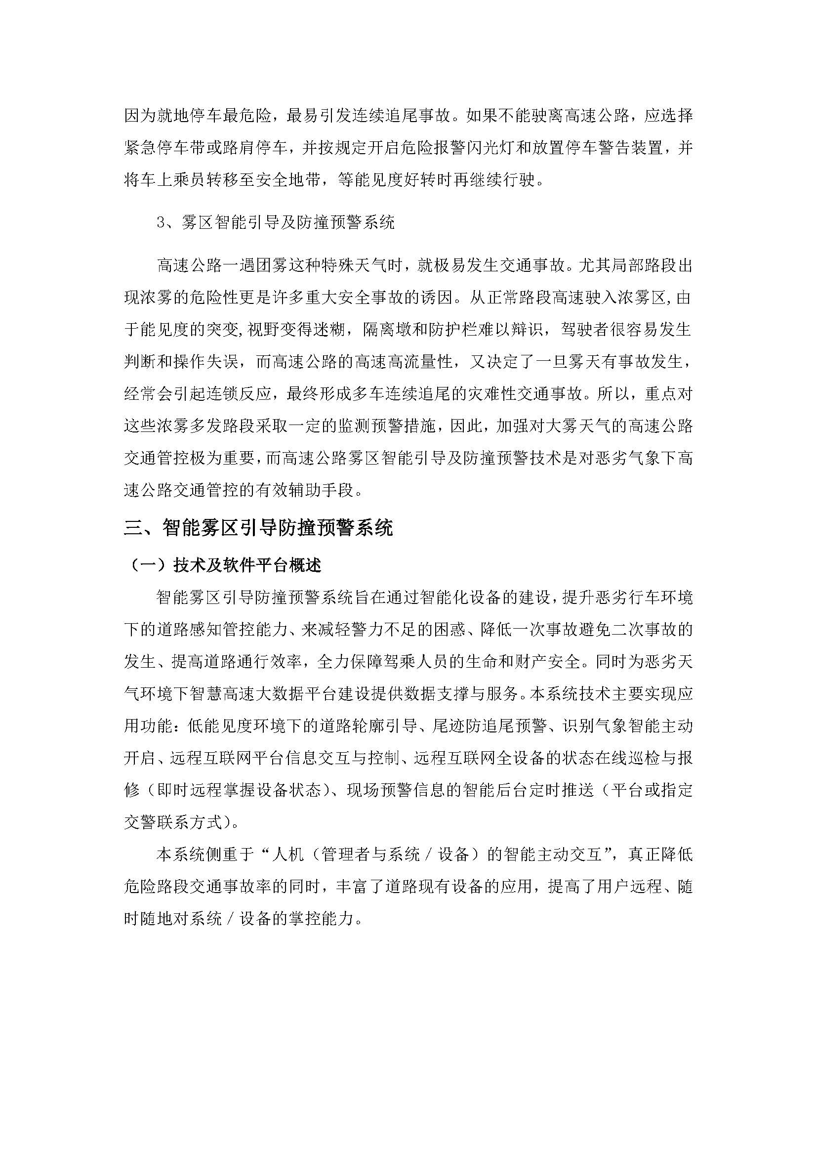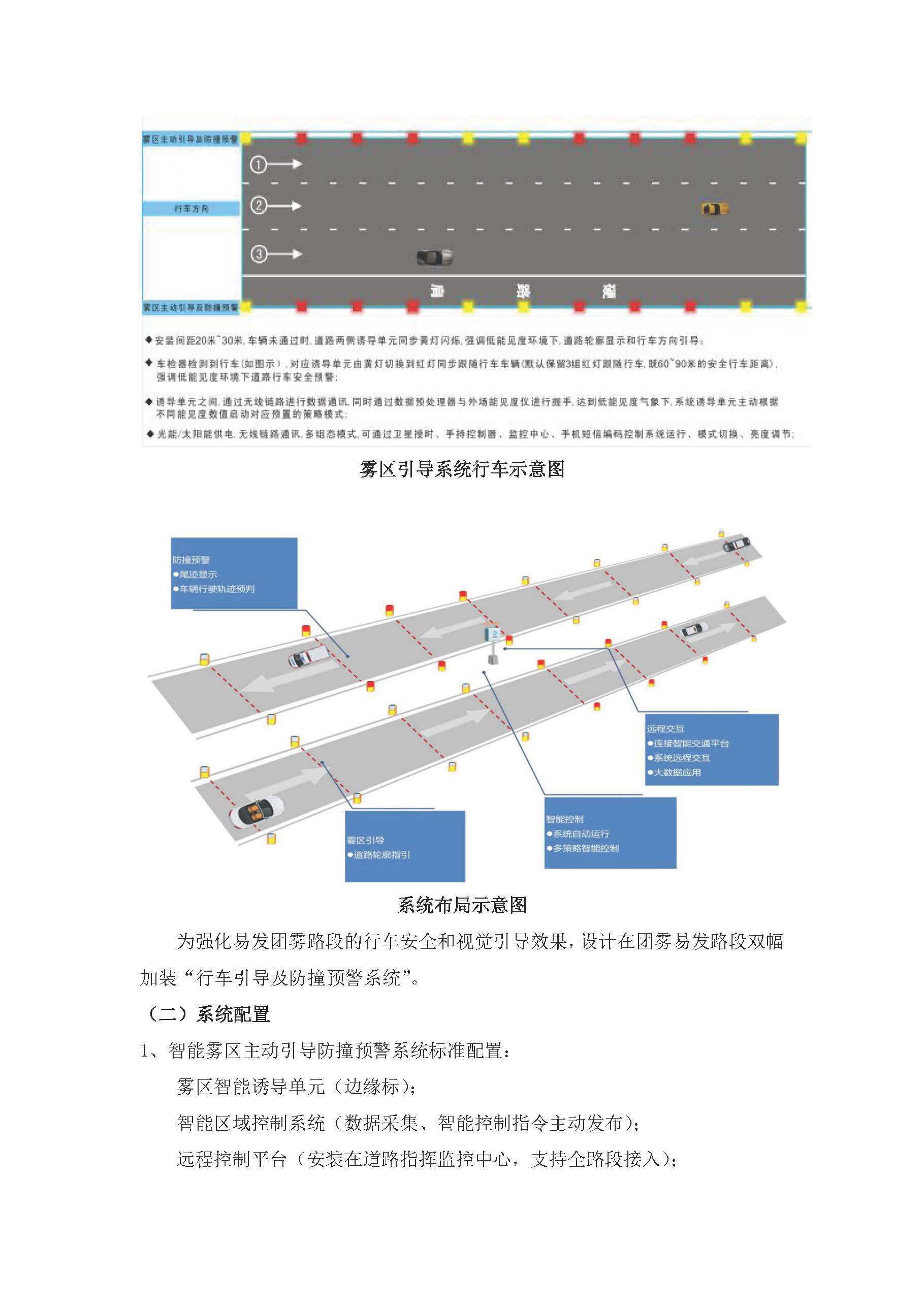 智能雾区引导防撞预警系统旨在通过智能化设备的建设,提升恶劣行车环境下的道路感知管控能力、来减轻警力不足的困惑、降低一次事故避免二次事故的发生、提高道路通行效率,全力保障驾乘人员的生命和财产安全。同时为恶劣天气环境下智慧高速大数据平台建设提供数据支撑与服务。本系统技术主要实现应用功能:低能见度环境下的道路轮廓引导、尾迹防追尾预警、识别气象智能主动开启、远程互联网平台信息交互与控制、远程互联网全设备的状态在线巡检与报修(即时远程掌握设备状态)、现场预警信息的智能后台定时推送(平台或指定交警联系方式)。