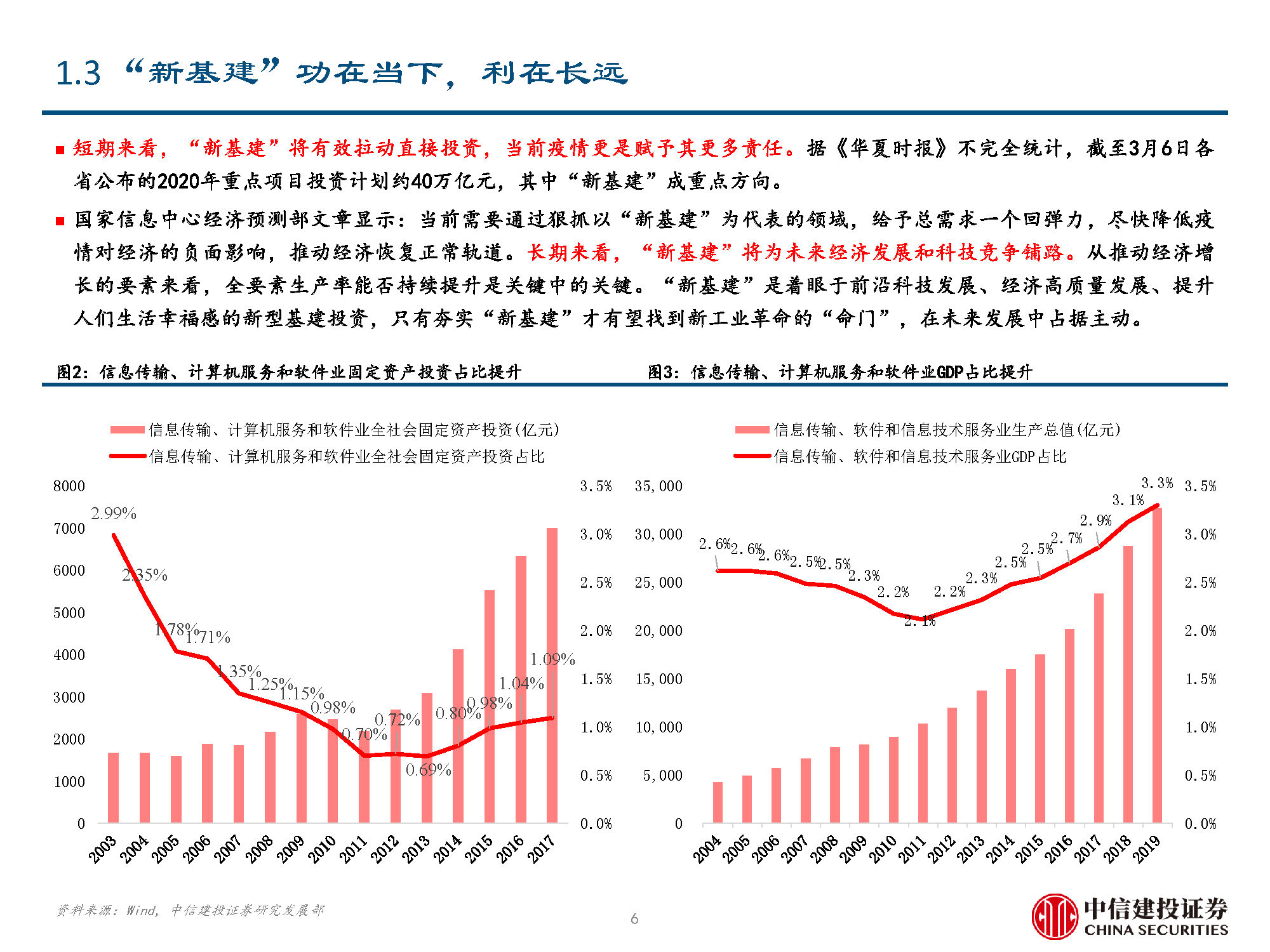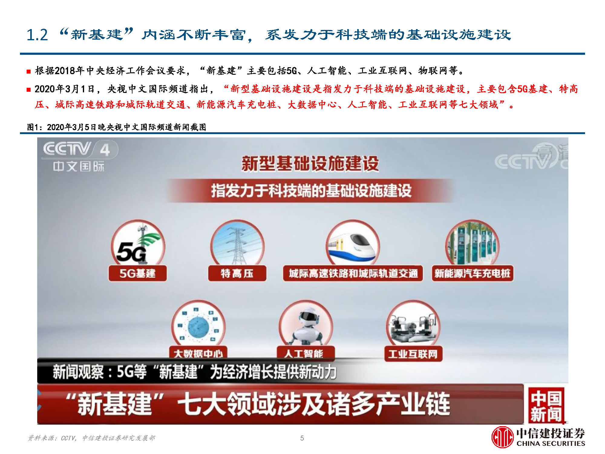 2018年12月,中央经济工作会议首次提出“新基建”,即新型基础设施建设。会议强调,“要加大制造业技术改造和设备更新,加快5G商用步伐,加强人工智能、工业互联网、物联网等新型基础设施建设,加大城际交通、物流、市政基础设施等投资力度,补齐农村基础设施和公共服务设施建设短板,加强自然灾害防治能力建设”。
