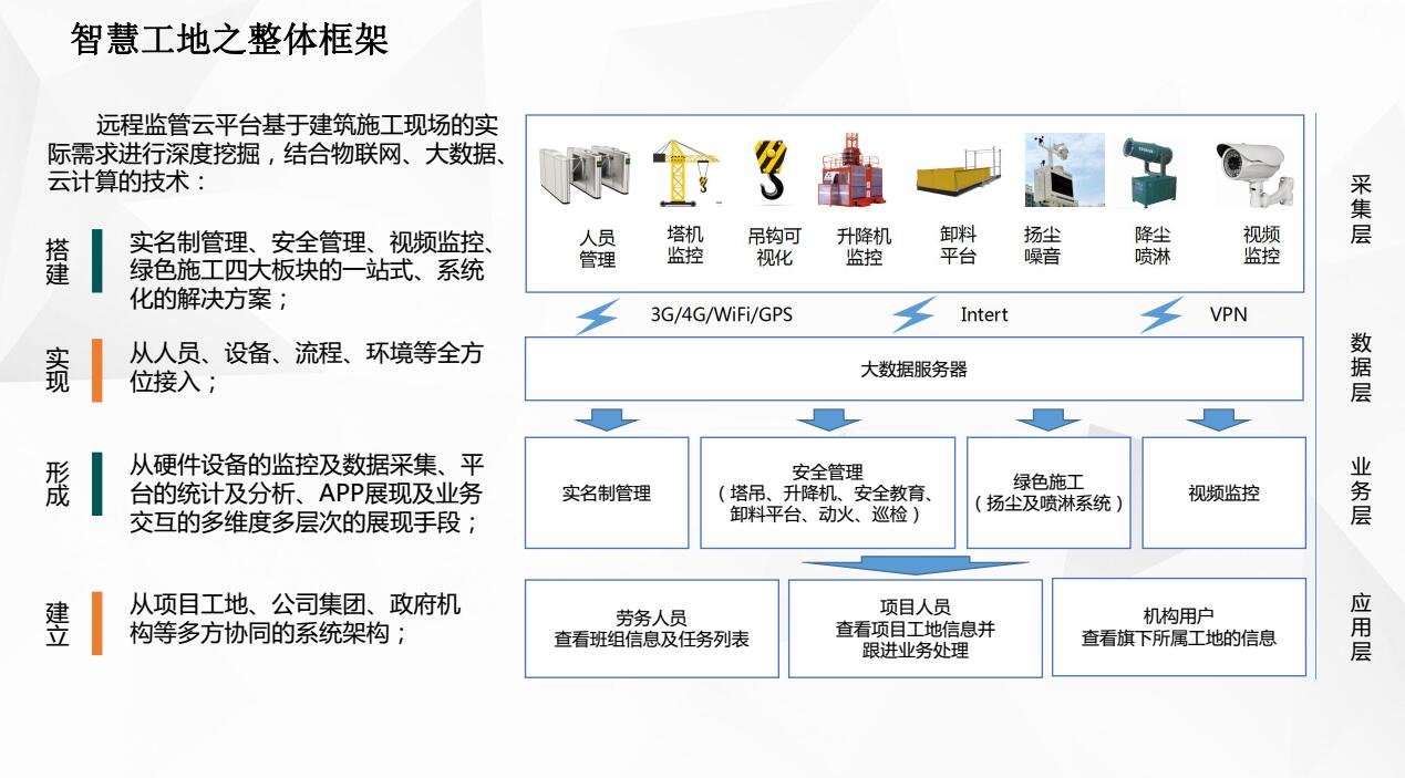 “智慧工地”是“智慧地球”理念在工程领域的行业具现,是一种崭新的工程全生命周期管理理念。“智慧工地”在广义上指工地信息化。通过三维设计平台对工程进行精确设计和模拟,围绕施工过程管理,建立互联协同、安全监控、智能化生产、等项目信息化生态圈,并将此数据在虚拟现实环境下与物联网采集到的工程信息进行数据挖掘分析,提供过程趋势预测及专家预案,实现工程可视化智能管理,以提高工程管理信息化水平,从而逐步实现绿色建造和生态建造,使项目在信息化时代的竞争中立于不败之地。