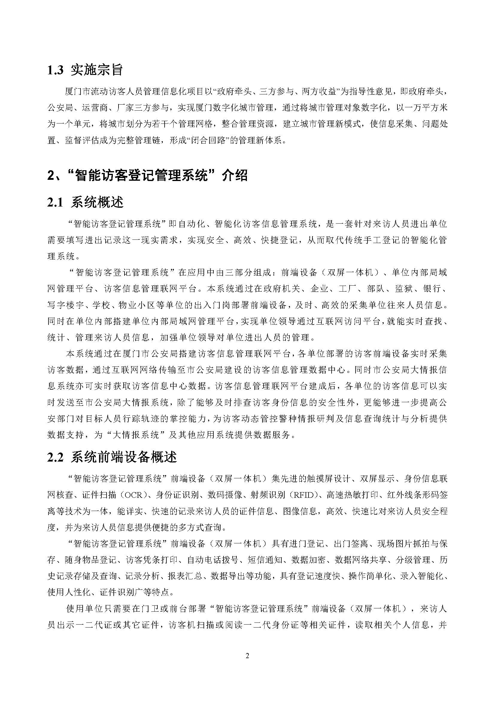 伴随着当前市场经济的高速发展,厦门市外来人员流动性越来越大,且人员数量呈逐年递增趋势,给受访单位和部门的管理带来较多安全隐患。特别是政法部门、工商、税务、民政、城建、海关、外交、质检、社保、银行、交通、电信、邮政、电力、民航、学校、证券、保险、工厂等单位和部门访客数量大,据不完全统计全市每日访客数量约达10~30万人次,并具备流动性强、成分复杂等特点,传统的手工访客登记管理方式已适应不了单位信息化的需要,给城市治安造成较大隐患,成为当前迫切需要解决的问题。